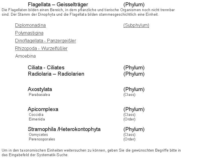 Um in den taxonomischen Einheiten weitersuchen zu können, geben Sie die gewünschten Begriffe bitte in das Eingabefeld der Systematik-Suche.